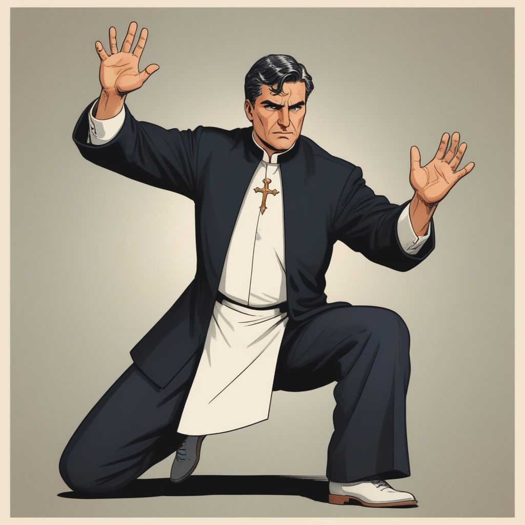 A roman catholic priest doing kung-fu, clerical black suit with Roman collar, colored inked, flat colours comics
