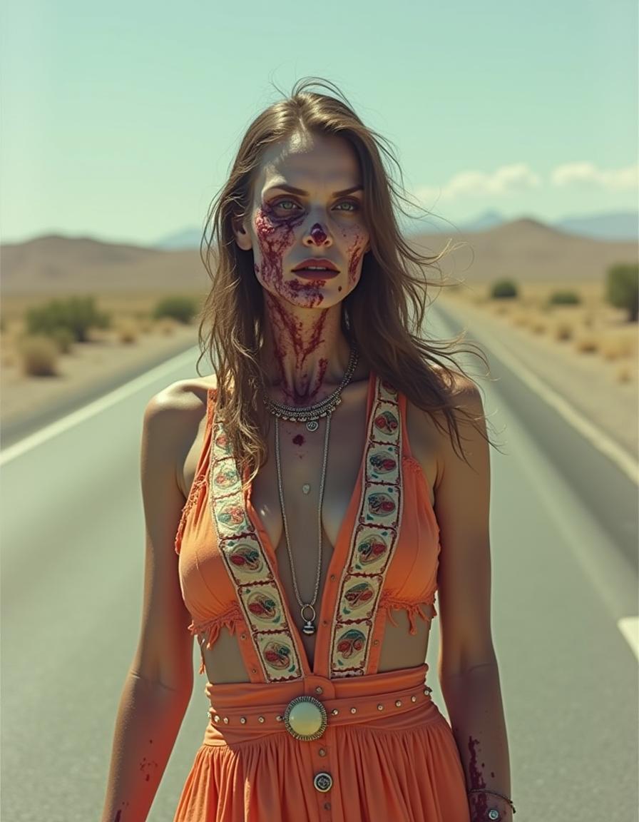 1960s glamour shot, a zombie in a fashion shooting wearing a Hippie tunic with ethnic prints, 1960 Bohemian Style, raw flesh, zombie peeling skin, decaying, film grain, american highway in the background, desaturated colors, 1960 magazine cover