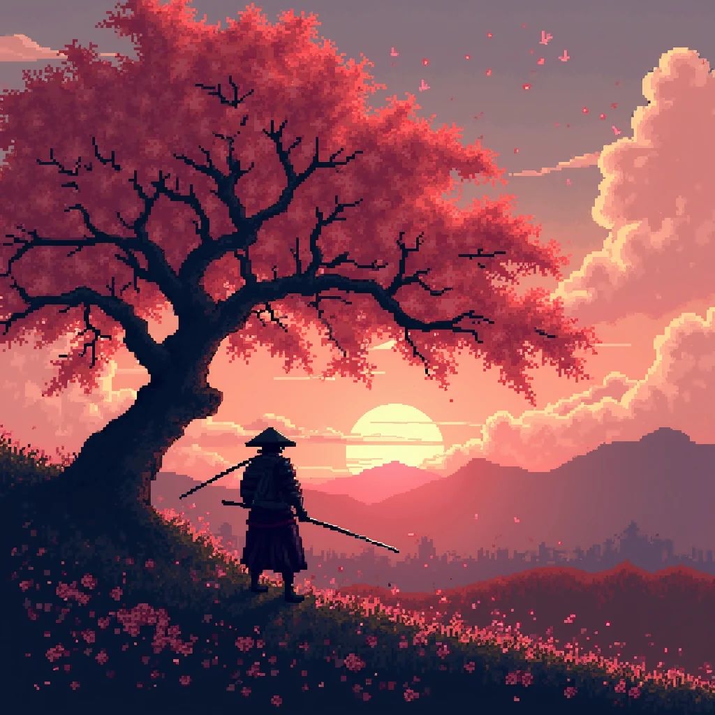 An intense battlefield in a pixelated feudal Japan. A lone samurai stands under a cherry blossom tree, its petals drifting in the wind. The glowing red sunset casts long shadows, while distant mountains frame the scene.