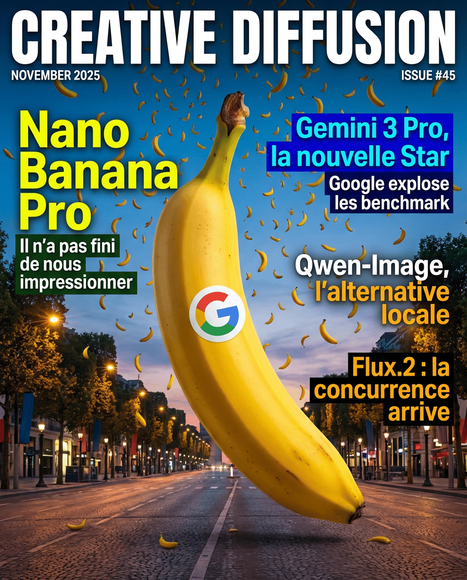 Crée une couverture de magazine dynamique et moderne pour le magazine "Creative Diffusion" (numéro de novembre 2025). Le fond principal est une vue des champs elyséee au crépuscule, avec de minuscules bananes dans les airs, qui semblent tombées du ciel. Au centre, une Banane Géante. Elle porte un autocollant avec le logo de Google. Autour de la banana, dispose des titres de magazines dans des polices éditoriales épurées, en équilibrant le bleu foncé, le blanc et le jaune orangé. Dispose-les selon la même hiérarchie réfléchie que celle d'une publication magazine. • En haut à gauche : "Nano Banana Pro" en jaune vif avec sous-texte en vert foncé : "Il n'a pas fini de nous impressionner" • En haut à droite : "Gemini 3 Pro, la nouvelle Star" en bleu intense avec sous-texte : "Google explose les benchmark" • Centre droit : "Qwen-Image, l'alternative locale" et "Flux.2 : la concurrence arrive"